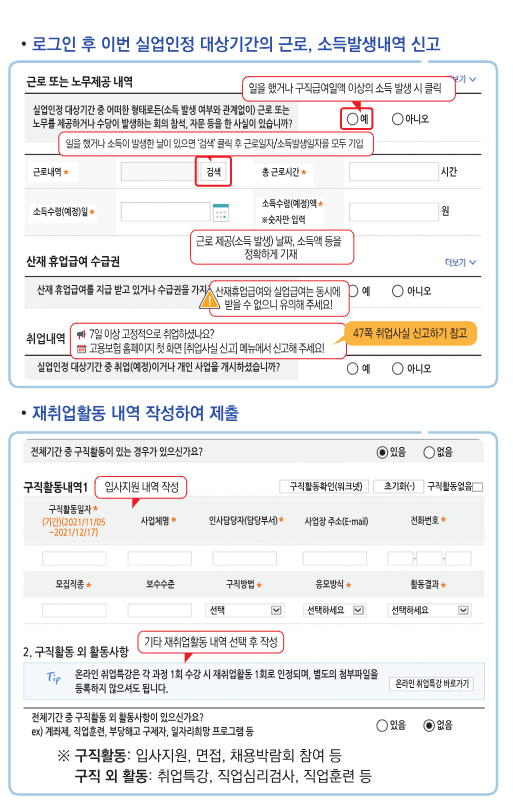 실업인정 대상기간 중에 취업, 사업자 등록, 기타 소득 등이 발생하였을 시 신고하지 않으면 전액 환수 및 2배 추가징수와 형사처벌이 될 수 있으니 주의하시기 바랍니다.